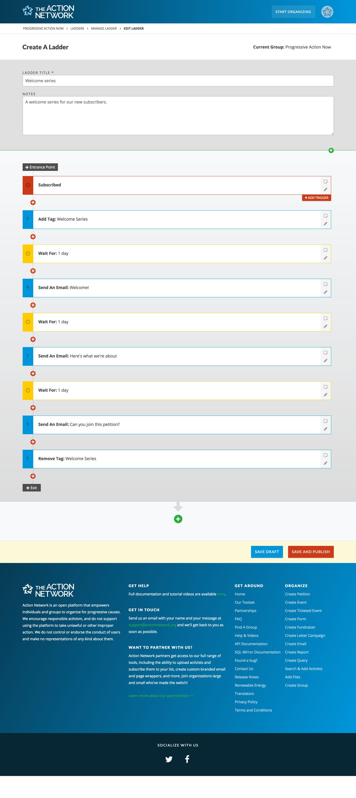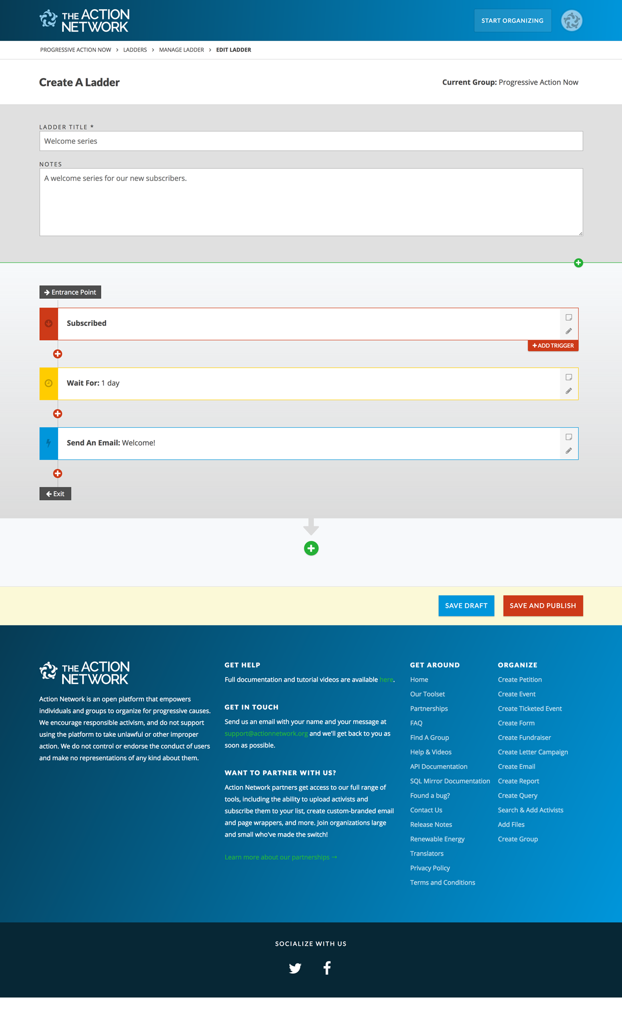 A simple welcome series would contain a single rung with the trigger "Subscribed", meaning activists will enter the ladder when they subscribe to the group's list.