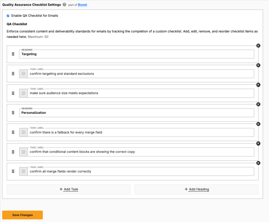 Items on the checklist can be reorganized as headings and tasks by drag and drop. Click Save Changes once you have added your checklist items.